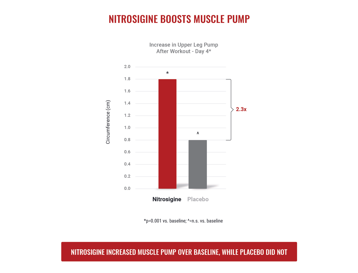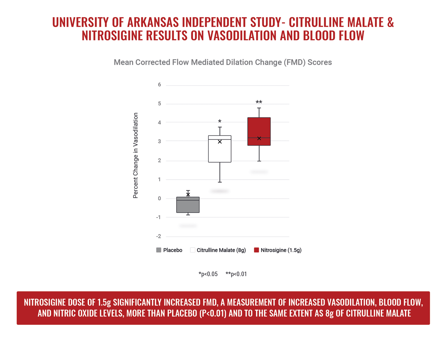Size Does Matter: In March of 2020, researchers at The University of Arkansas published an independent study that showed that a single dose of Nitrosigine increases blood flow and vasodilation. In fact, it only took 1.5g of Nitrosigine vs. 8g of Citrulline Malate to achieve the same result.