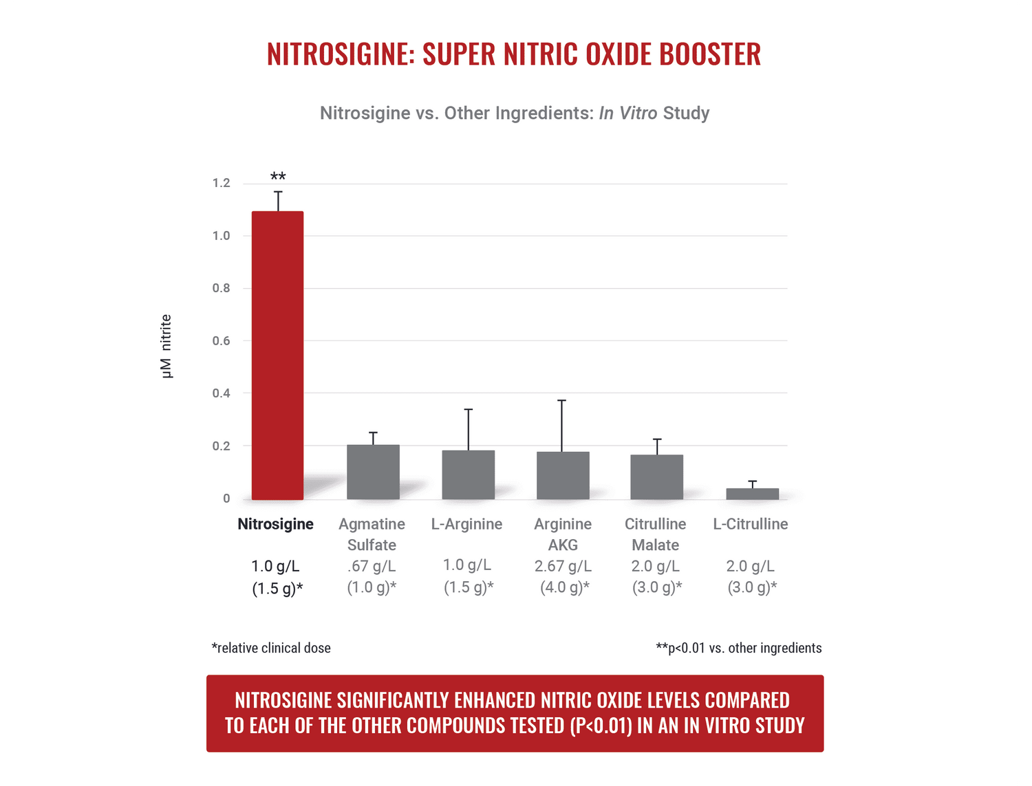 A university study showed that 1.5 grams of Nitrosigine is as powerful as 8 grams of Citrulline Malate for increases in nitric oxide and blood flow.
